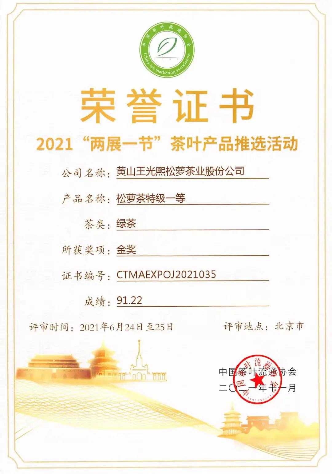 黄山王光熙松萝茶业股份公司生产并送样参评的三类等级茶叶均获奖项。