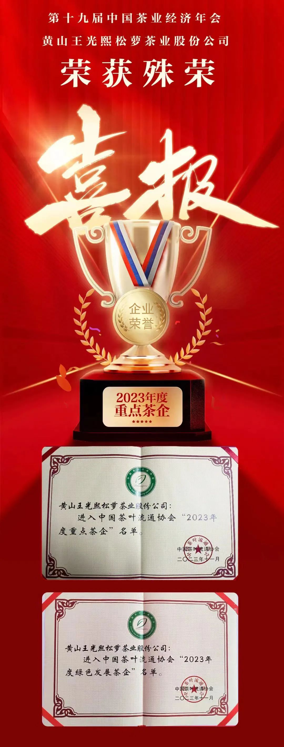 在此次的2023中国茶叶行业年度榜单中,黄山市王光熙松萝茶业股份公司荣获“2023年度重点(百强)茶企”、“2023年度绿色发展茶企”称号。